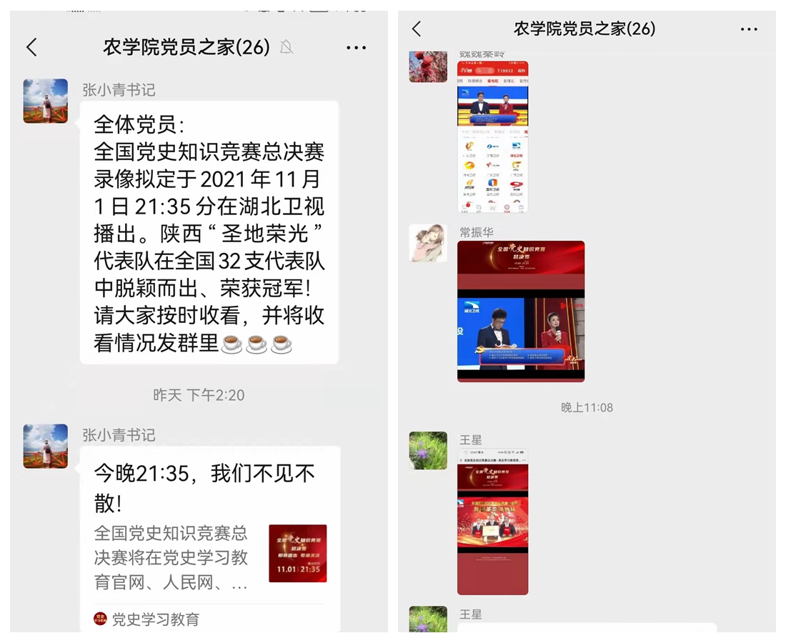 公司党总支高度重视全国党史知识竞赛总决赛收看工作。决赛录像播出之前,我们在党员群发出收看通知,并转发了党史学习教育官网当日文章《今晚21:35,我们不见不散!》,提醒党员们按时收看。11月1日晚,全体党员干部利用电视、手机、网络、党史学习教育官网等积极收看比赛,一起为陕西队加油助威,鼓劲喝彩。