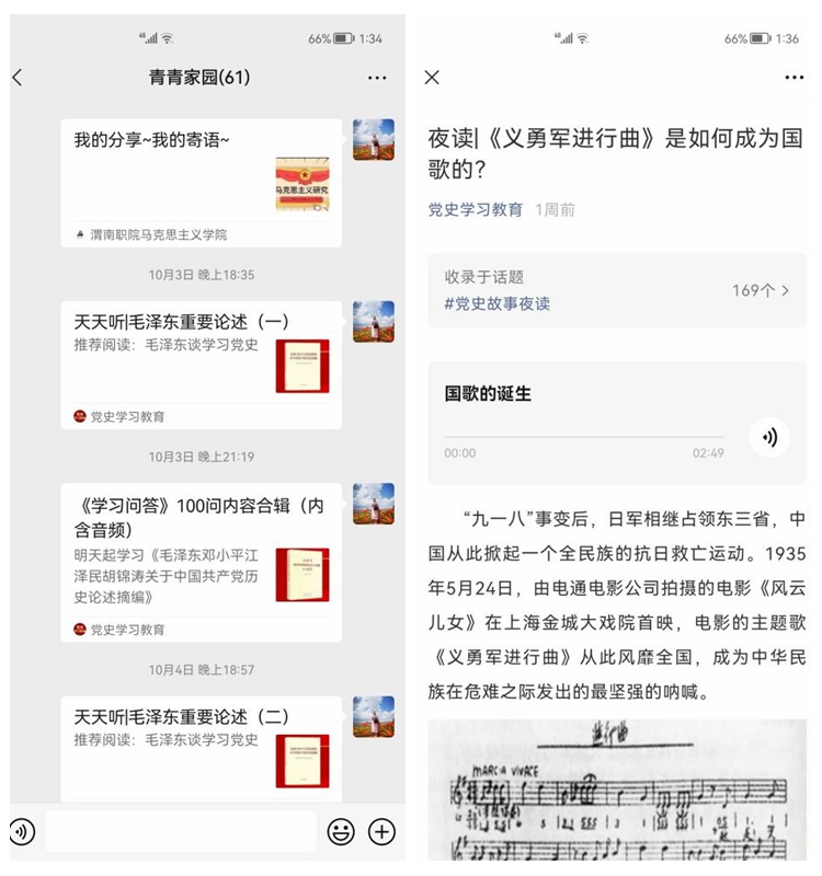 在党员干部中,把认真学习贯彻习近平总书记“七一”重要讲话和来陕考察重要讲话精神作为首要政治任务,鼓励他们学史力行,在服务师生做好事做实事上作表率。在员工中,扎实开展党史学习教育和形势政策教育,引导青年员工坚定理想信念,在学好党史践悟思想上当先锋,在砥砺奋斗成才报国上勇担当,传承红色基因,书写华彩青春!一是继承先烈遗志,传承信仰的力量。广大师生利用手机、电脑等重温9月30日上午在北京天安门广场隆重举行的烈士纪念日向人民英雄敬献花篮仪式。英烈们用鲜血浇灌理想,用生命践行使命,用奉献书写人生,在中华民族的历史长河中构筑起一座座不朽的精神丰碑。广大师生表示,要学习英烈身上的爱国精神、奋斗精神、奉献精神,砥砺奋进、奋发作为,为现中华民族伟大复兴中国梦贡献自己的智慧和力量。二是假期党史学习教育不断线。党总支在伟德bv国际体育党员和教工“青青家园”群推送由党史学习教育领导小组办公室指导,人民网.中国共产党新闻网承办的“党史学习教育”公众号文章《中华人民共和国简史》导读及“天天听 毛泽东重要论述”共6期。三是个人自学不放松。党员干部和员工利用“学习强国”学习平台、“渭南互联网+党建云平台” “渭南职院”、渭南职院“团委”、“马院”等公众号进行党史学习。