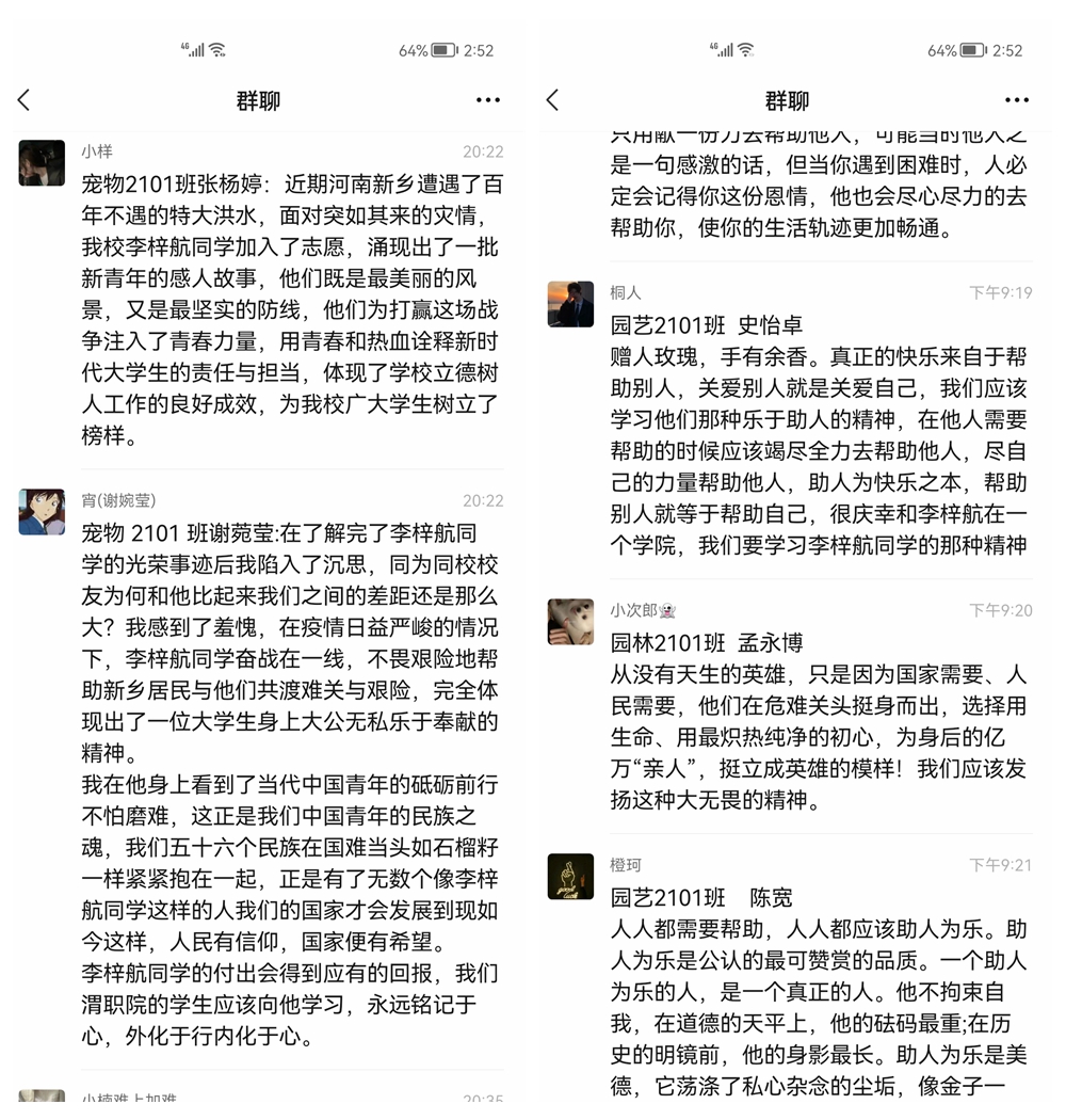 各班利用晚自习班会进行学习和交流。同学们为身边的榜样感到骄傲和自豪。纷纷在班级微信群表达了自己的心声。