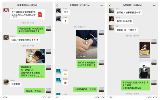 润物无声化春雨。一是员工入学前各班建立班级群,让同学和老师们互相认识和了解,确定临时班干部,加强管理与沟通。群里互动气氛热烈,生动有趣。大家互作自我介绍,介绍家乡名胜古迹和地方特产,为祖国幅员辽阔地大物博感到骄傲和自豪。二是弘扬中华优秀传统文化,根据时令节气变化,介绍中秋节、重阳节、寒露等风俗习惯和文化知识,引导同学们热爱传统文化,自觉做传统文化的传播者和践行者。三是发挥典型示范引领作用,宣传近年来公司涌现出的优秀员工代表,用身边人身边事教育入校新生,鼓励他们树立信心,确定目标,勤学苦练,全面发展。四是关心员工冷暖,经理杨世选、总支副书记张小青、副经理付宏岐、办公室主任王百祥、辅导员樊永忠、李玉霄等经常到到宿舍看望生病员工,为他们送饭送药,并通过打电话发短信等形式跟进了解员工身体状况。根据气候变化情况,随时随地提醒同学们添衣保暖,谨防感冒。五是积极关注未返校员工思想动态和学习状况,及时回复员工疑虑困惑,鼓励他们增强信心,随时关注疫情变化,有序做好返校准备。