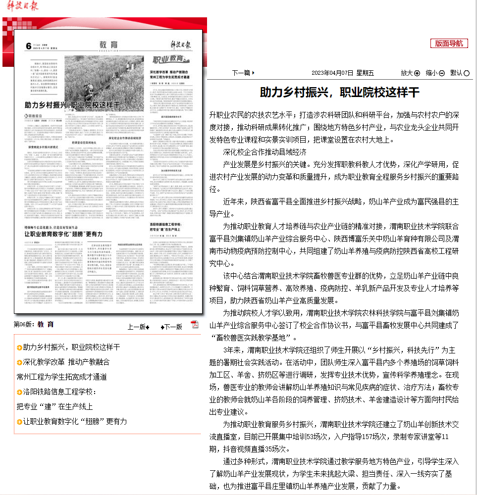 4月7日,《科技日报》以“助力乡村振兴,职业院校这样干”为题,报道公司深化校企合作推动县域经济,依托公司畜牧兽医专业群优势,共建奶山羊养殖与疫病防控陕西省高校工程研究中心和畜牧兽医实践教学基地,立足奶山羊产业链中良种繁育、饲料饲草营养、高效养殖、疫病防控、羊乳新产品开发及专业人才培养等项目,开展暑期社会实践活动,助力陕西省奶山羊产业高质量发展。