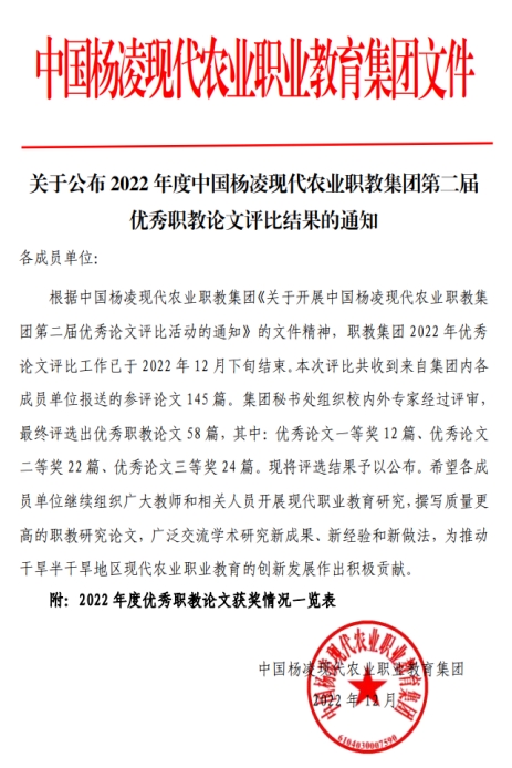 近日,由中国杨凌现代职业农业教育集团举办的2022年度中国杨凌现代农业职教集团第二届优秀职教论文评比和首届“农科杯”全国“互联网+”现代农业创新创业大赛圆满落下帷幕。经多个环节评选,公司伟德bv国际体育在2个赛项中荣获一等奖1项,二等奖1项,三等奖2项。