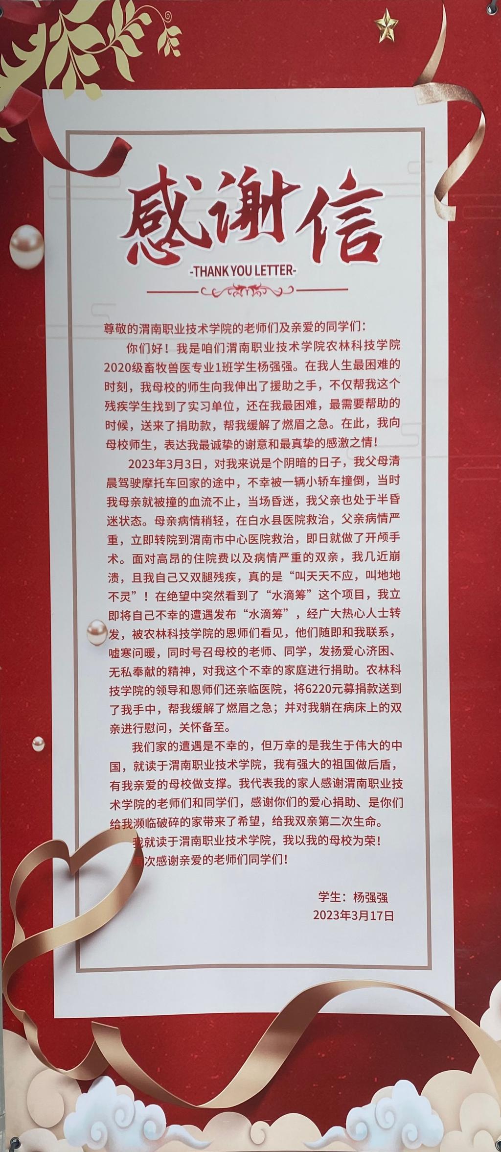 各位老师,公司2020级畜牧兽医专业1班员工杨强强,本人系建档立卡户,残疾员工,父母又因交通事故住院治疗,家庭经济岌岌困难。公司师生发扬爱心济困、无私奉献的精神,对这个不幸的家庭进行捐助,共募捐元人民币6220元,为杨强强同学提供了力所能及的帮助。杨强强同学特发来感谢信,表达自己的谢意。